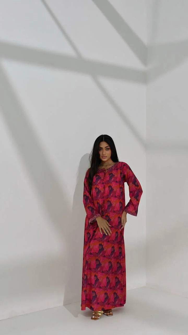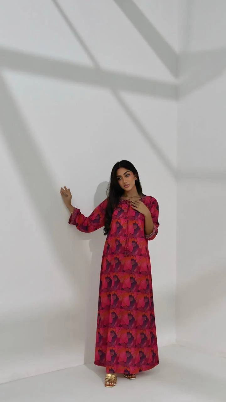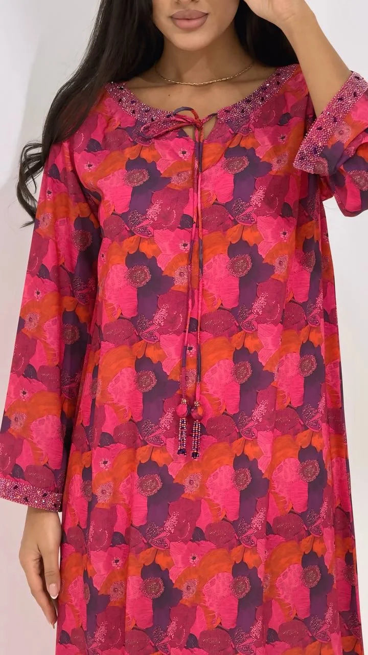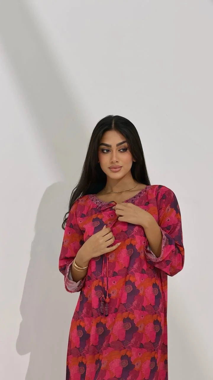 A celebration of color and grace. This floral dress brings together bold blooms, soft chiffon, and a touch of shimmer on the neckline and sleeves — making it perfect for effortless elegance, morning to evening.