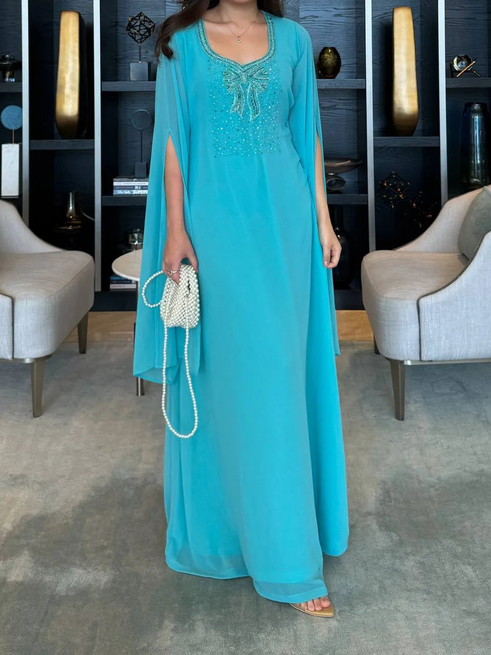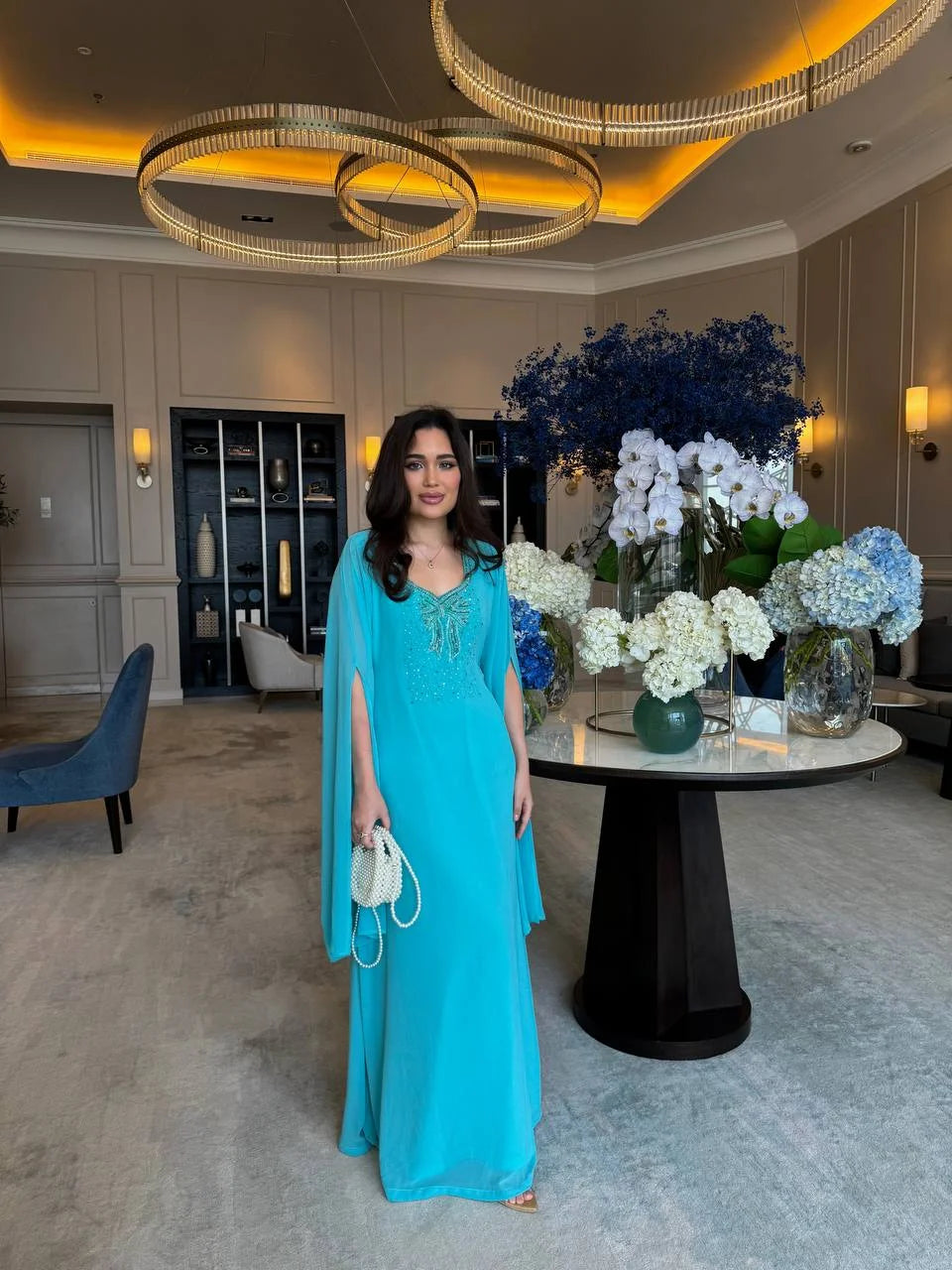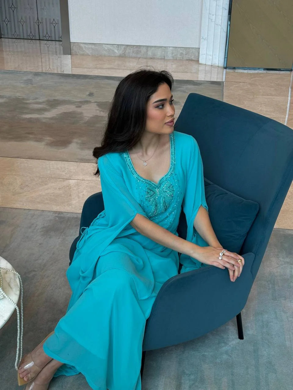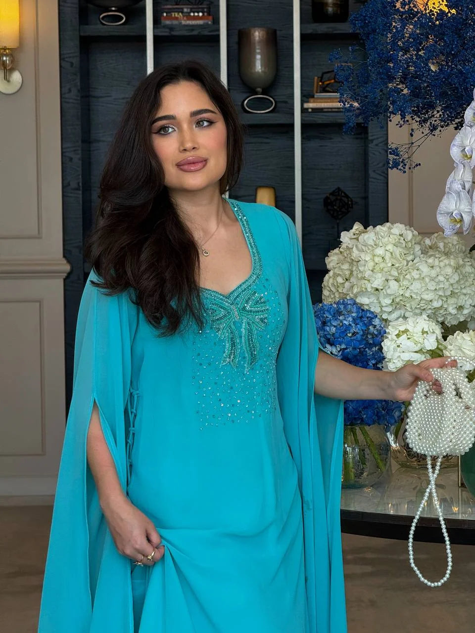 Simple yet striking, Bow Glow shines with soft turquoise tones and a delicate beaded bow at the neckline. A touch of sparkle adds charm to this airy silhouette — perfect for graceful, glowing looks.