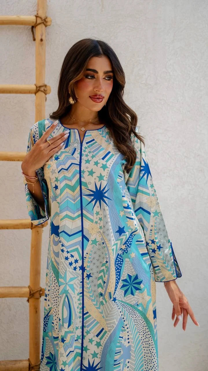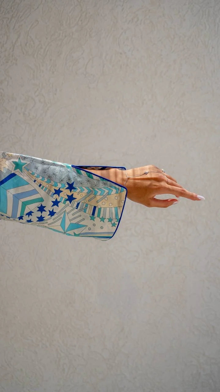 A luminous design inspired by the sky’s beauty, “Sky Light” features a celestial pattern of stars, moons, and fluid lines in serene blue tones. Light, elegant, and made to shine from day to night.