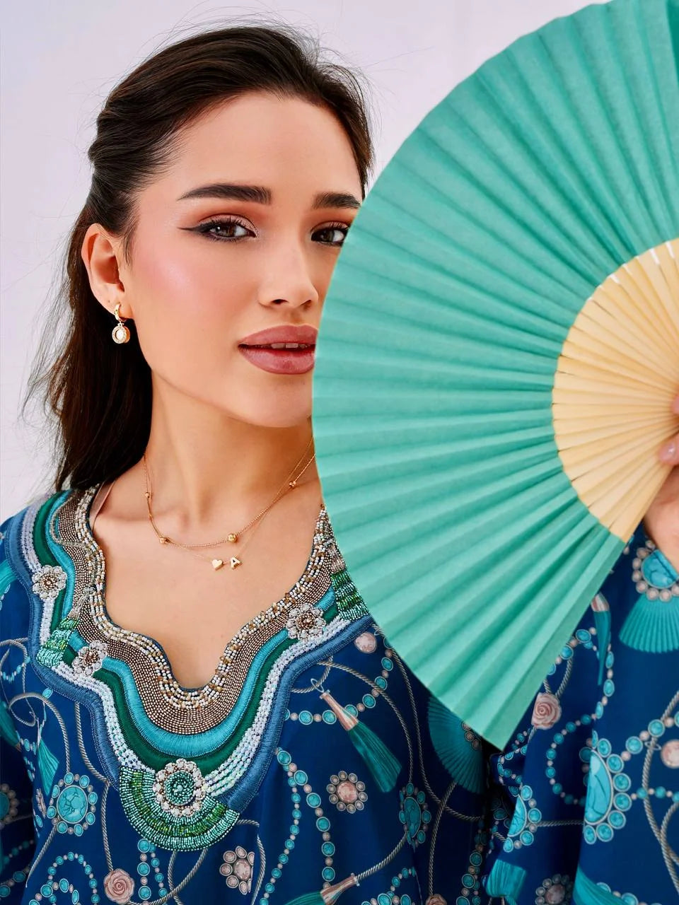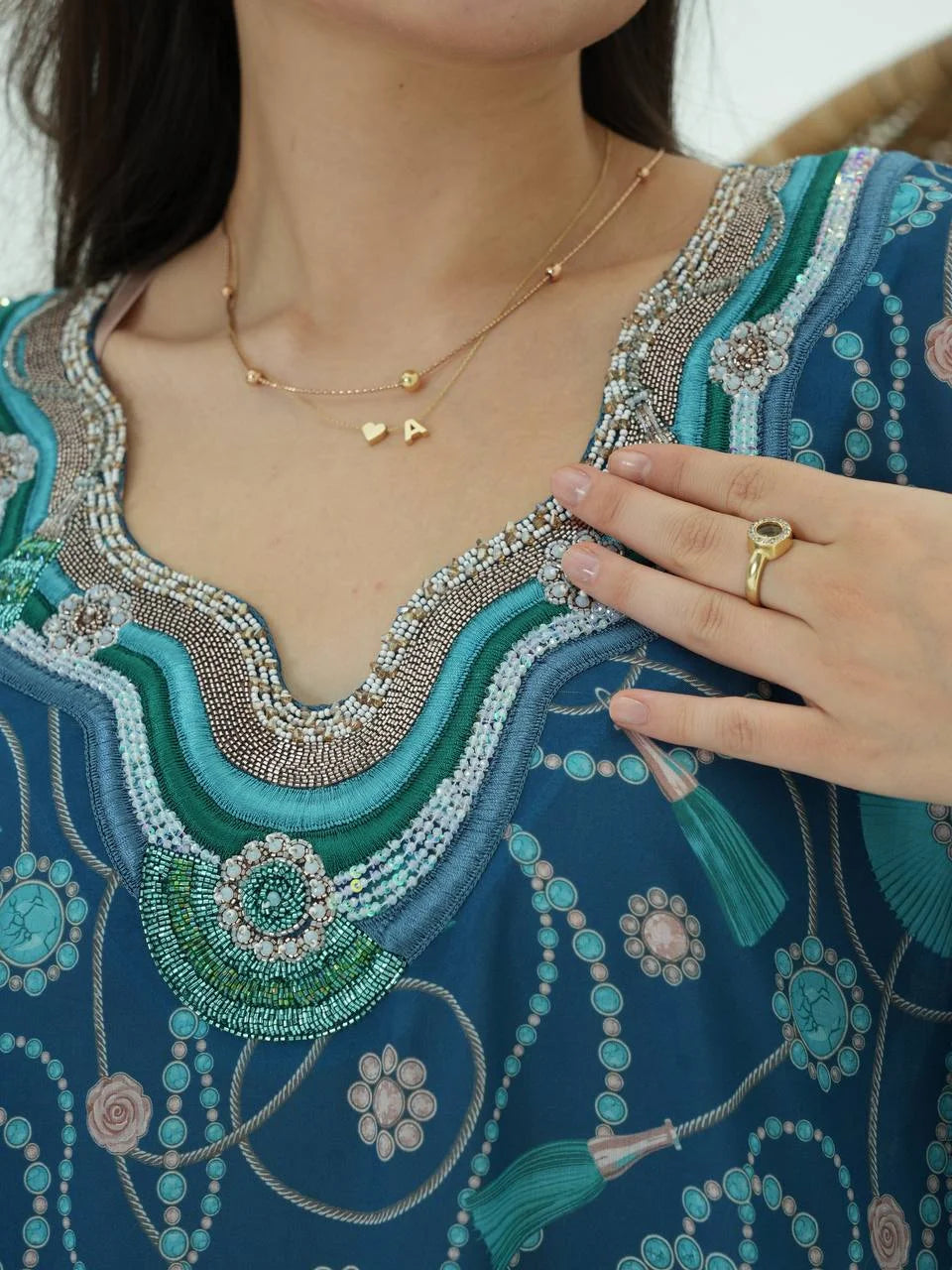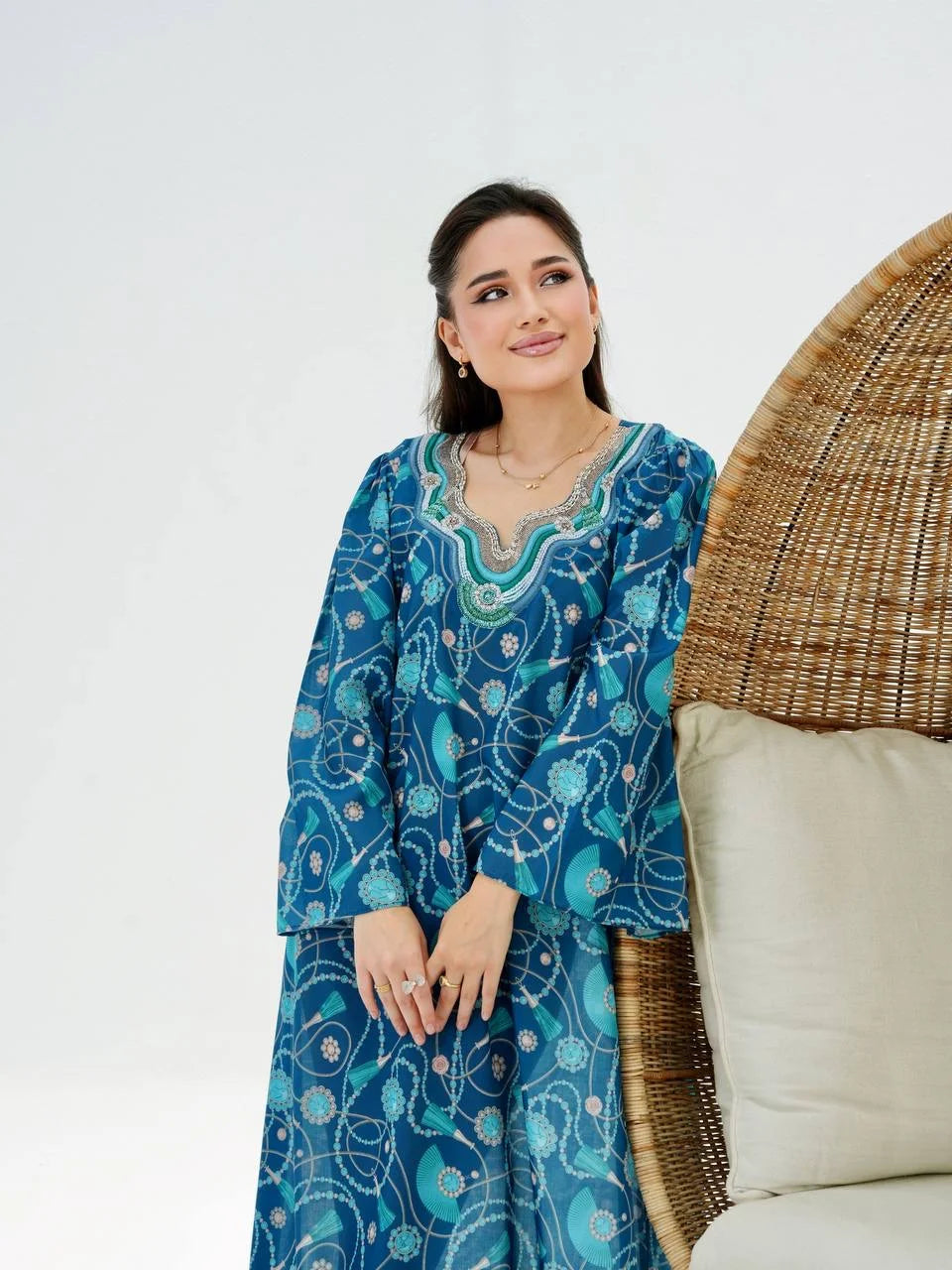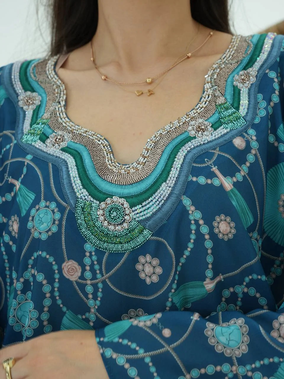 A vibrant blue dress brought to life with a detailed pattern of tassels, chains, and florals. The neckline is adorned with elegant embroidery in soft silver and blue tones, giving it a graceful, luxurious feel.